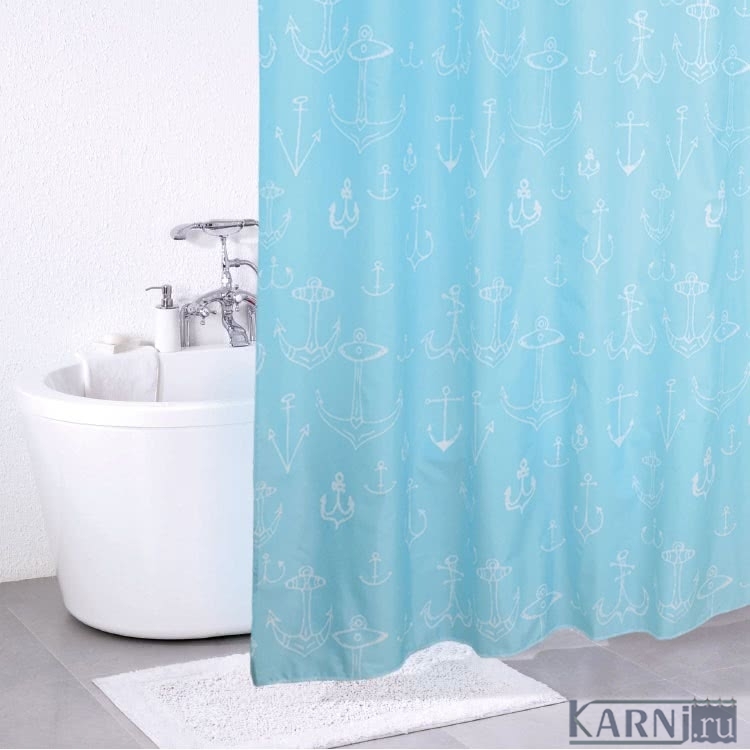 Занавеска для ванны с 12 вшитыми люверсами, надевается непосредственно на карниз (так же может использоваться с кольцами для удобства эксплуатации). Цвет: голубой. Штора обработана специальной пропиткой, отталкивающей воду.